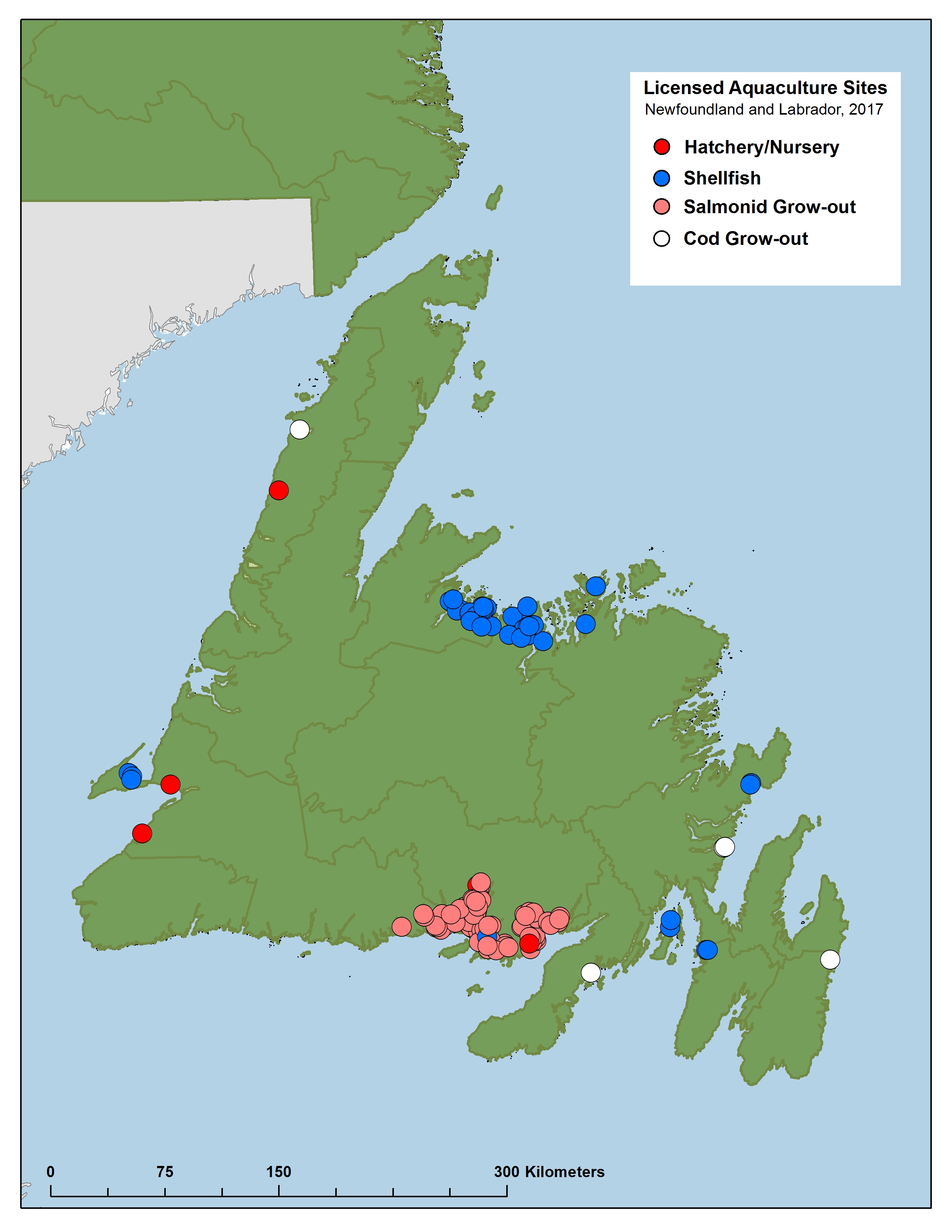 Atlantic salmon is the major salmonid species cultured in Newfoundland and Labrador. The sector is comprised of three large multinational companies, Mowi, Cooke Aquaculture and Grieg NL, operating marine cage sites along the south coast of the province. The south coast region is the only part of the province suitable for salmonid culture as the bays and fiords are generally ice free the entire year.