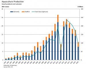 Specific areas within the province have been identified as desirable locations for aquaculture, including Notre Dame Bay, Green Bay, the Connaigre Peninsula, Bay d’Espoir, Fortune Bay, and Placentia Bay. These areas offer opportunities for all segments of the aquaculture industry, with proven results for salmonids and mussels. Total aquaculture production in 2020 was reported as 10,648 tonnes, valued at $95.9 million.